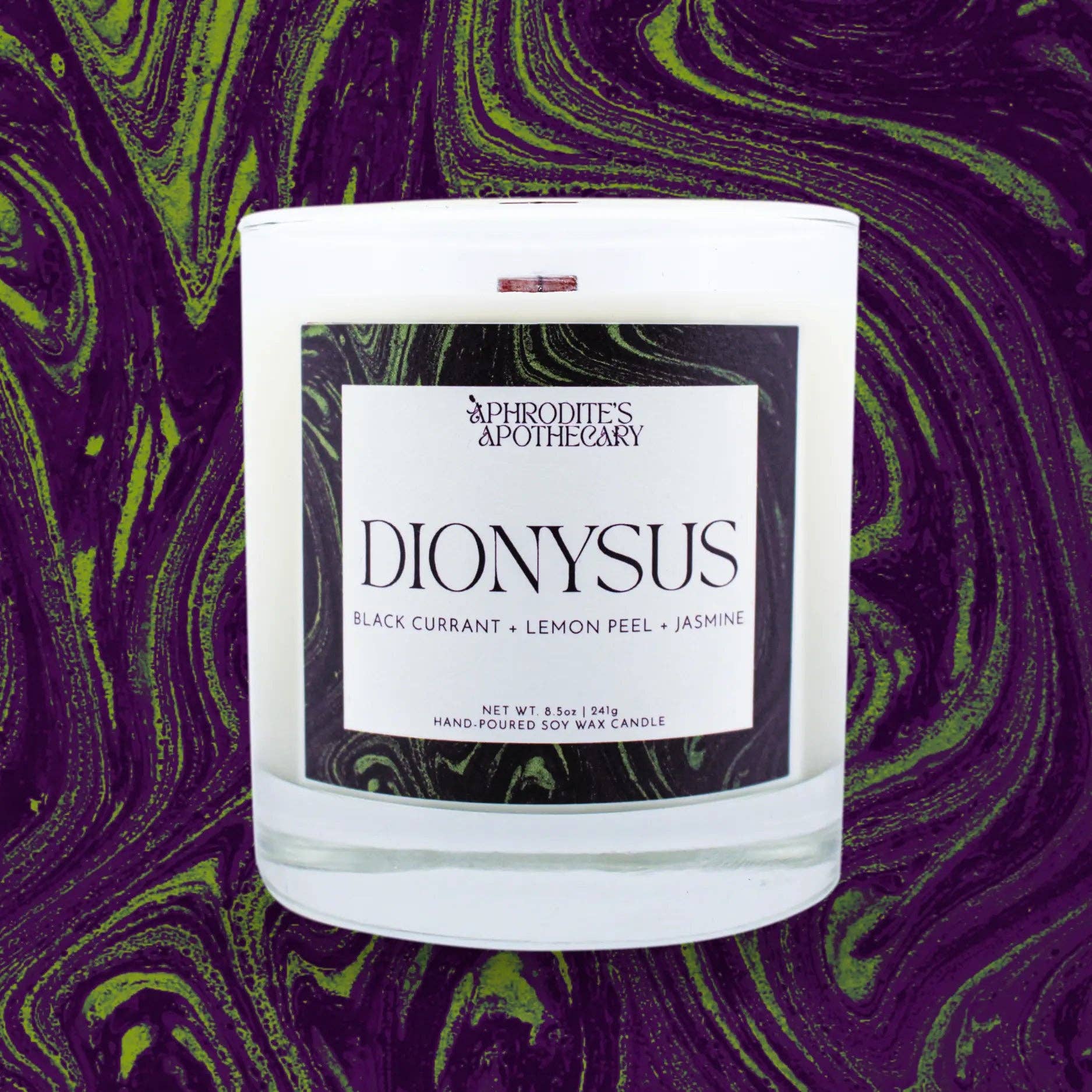 An indulgent combination of tart currant, grapefruit, lemon peel, and jasmine, our Dionysus Candle evokes the feeling of a raucous bacchanal (but without the vicious hangover). Like a fine cabernet sauvignon, our Dionysus Candle is tart and fruity unlike more traditional fruit fragrances that can be cloyingly sweet or artificial. The demigod Dionysus was the only member of the official Greek Pantheon that was not a full-fledged immortal (Hestia gave up her seat on Mount Olympus for him). As a god he ruled over wine, fertility, and madness -- and just like him, this candle sure is a party!