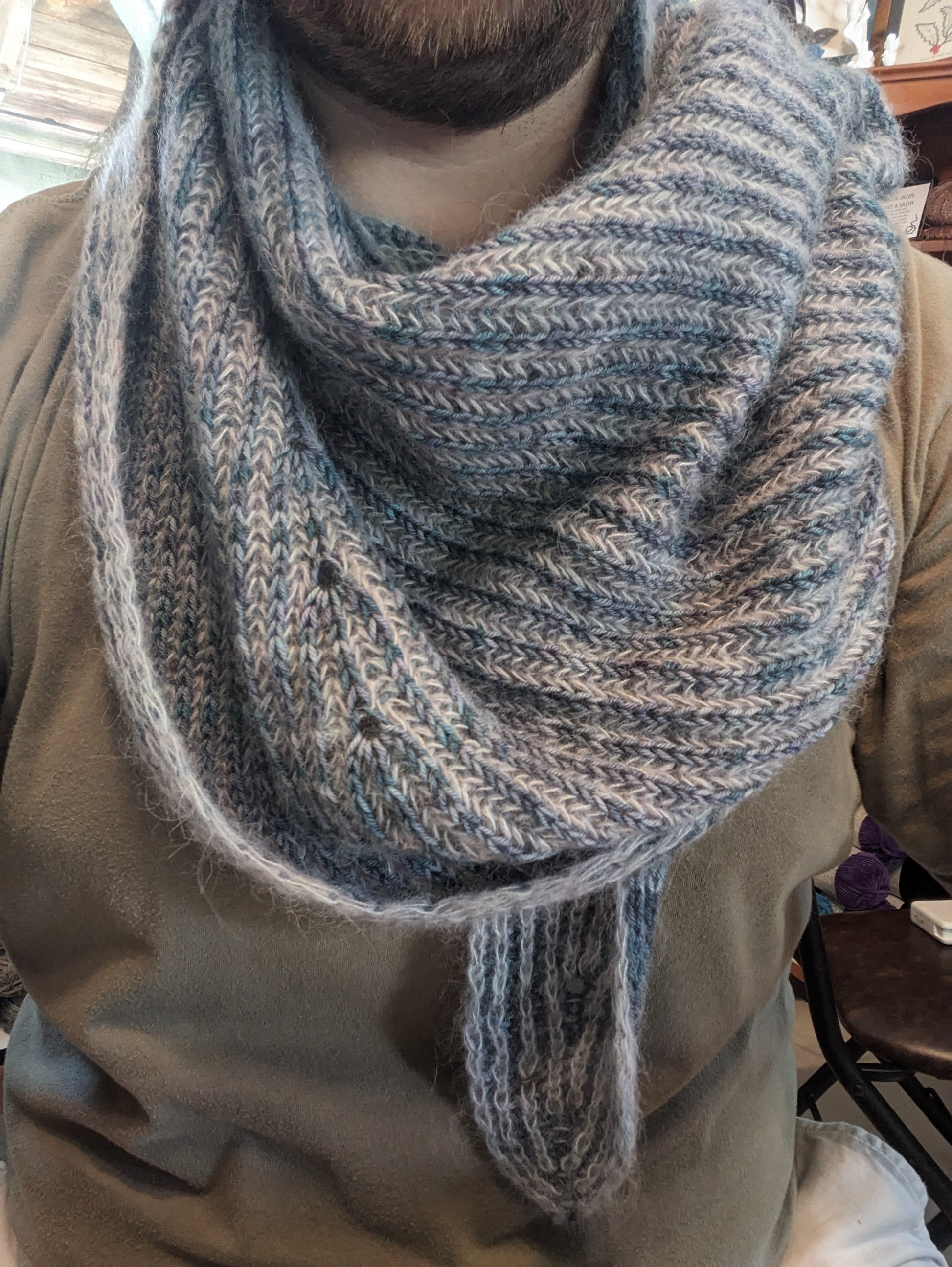 The Don't Look Back Shawl was inspired by the tale of Orpheus and Eurydice. It's a two-tone Brioche Shawl with a Fingering weight held to the foreground and a Laceweight in the background. The Laceweight can also be substituted with another Fingering weight.