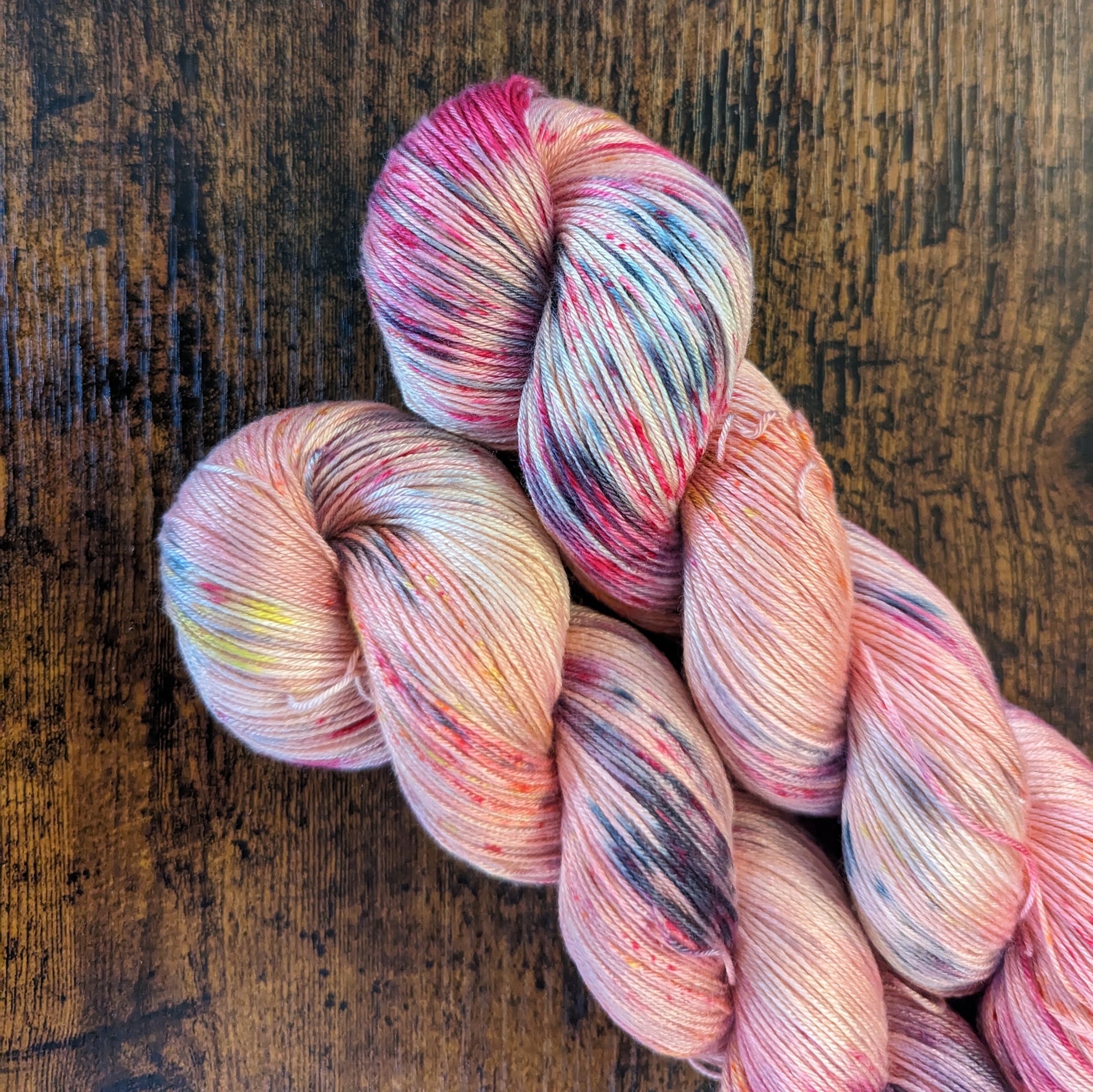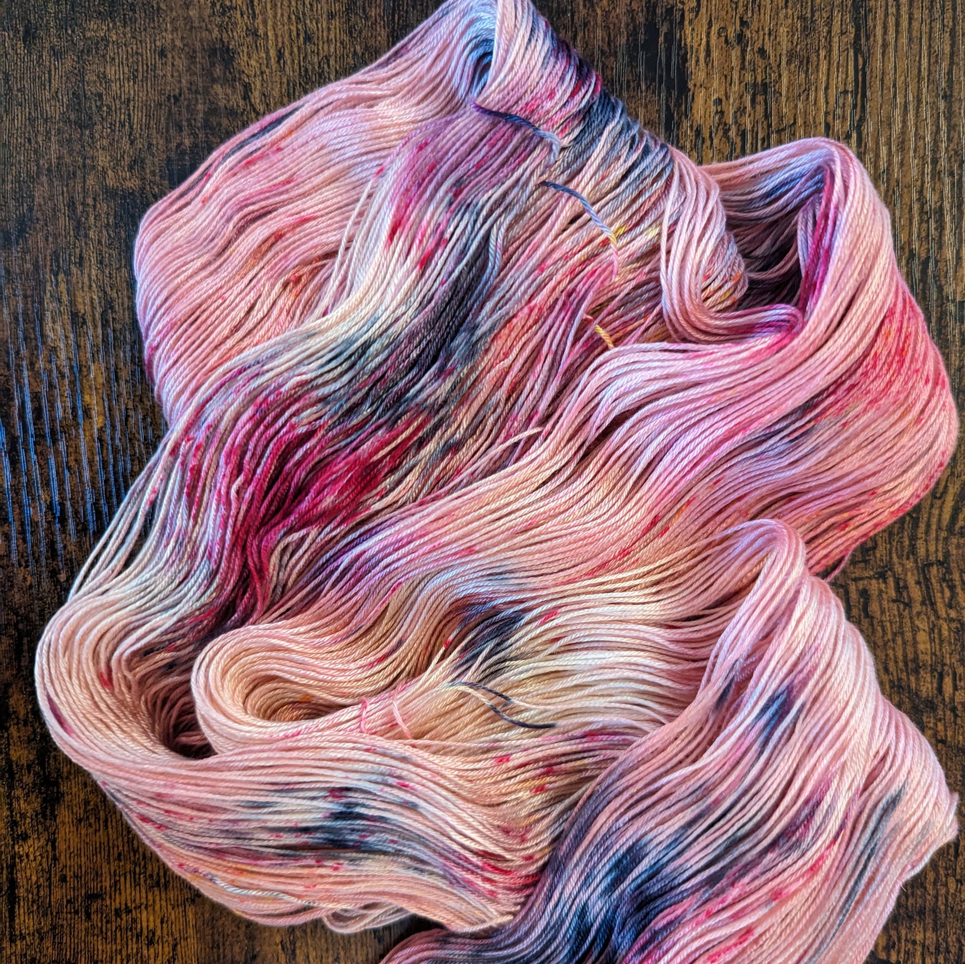 Fairy Garden shows a pale pink with all the speckling we love in our hand dyed wool making each stitch an adventure to the Seelie Court. The Cupro Cotton base lends a lovely shine and drape which will make for lovely garments and accessories.
