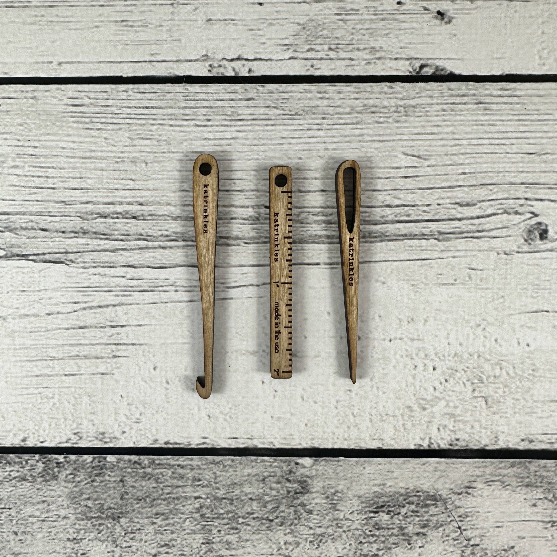 The handy mini tool set on our Fix It Keychain Loop features the ruler, yarn hook and tapestry needle from our popular Fix It Tool Set Necklace, presented in a more practical way for crafters who are more interested in using these helpful tools than displaying them. Looped on a sturdy ball chain, these little wonders are a great match for our other mini tools and are just as easy to toss in a project bag and always have at hand. Available in natural wood or in assorted acrylics; both options are durable, surprisingly useful and sure to become favorites of knitters and crocheters everywhere.