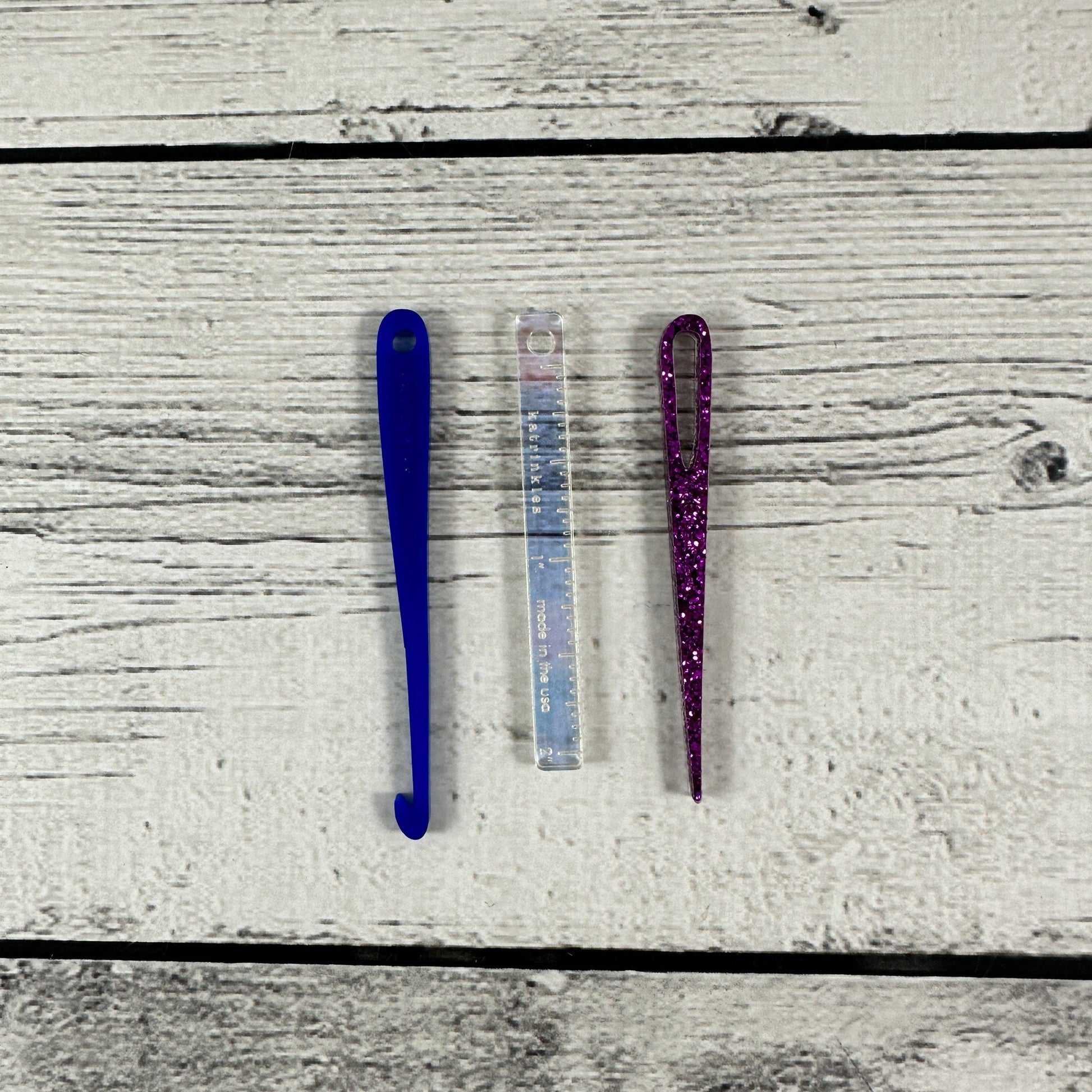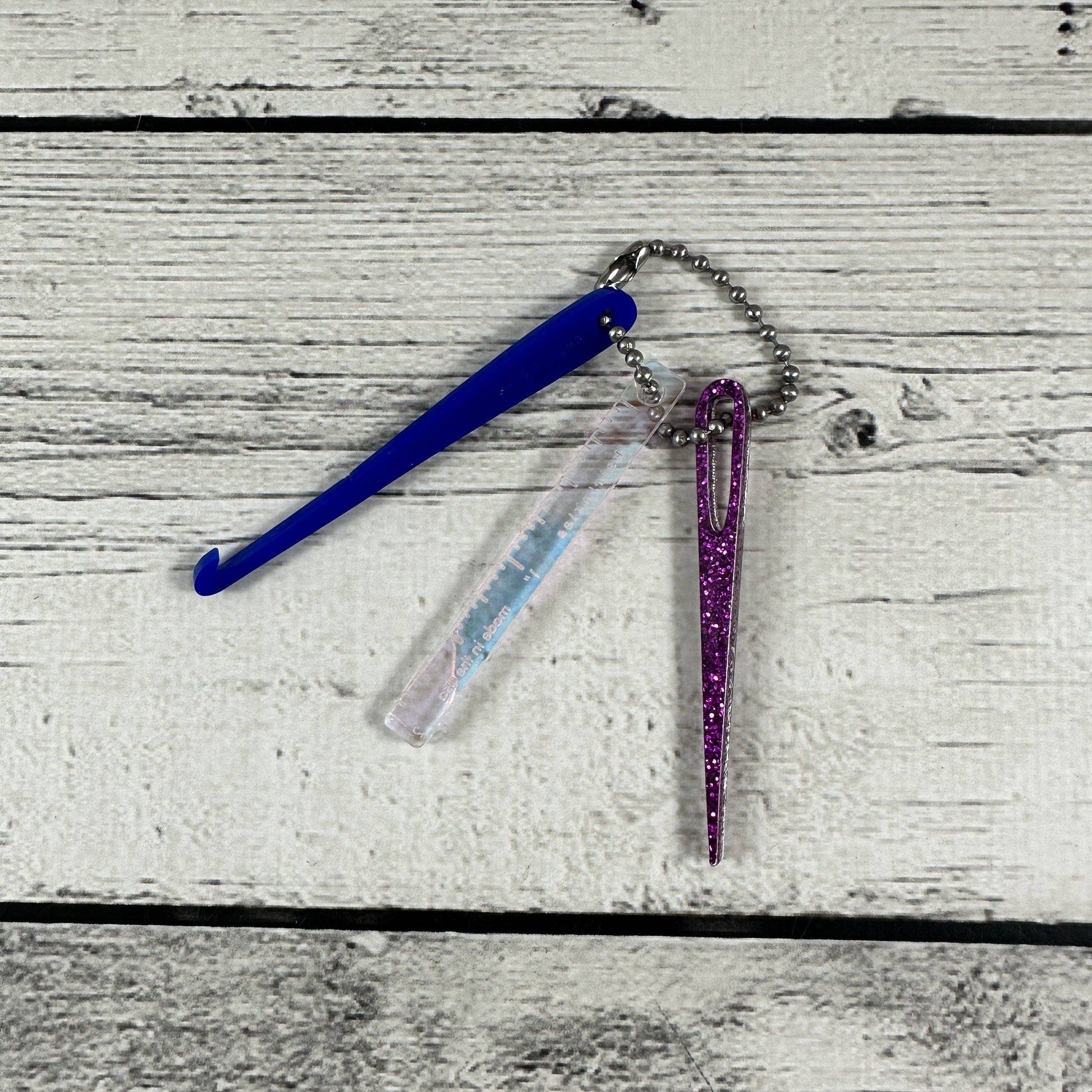 Includes a 2" Ruler, a Fix It Hook, and a Tapestry Needle, on a ball chain loop.