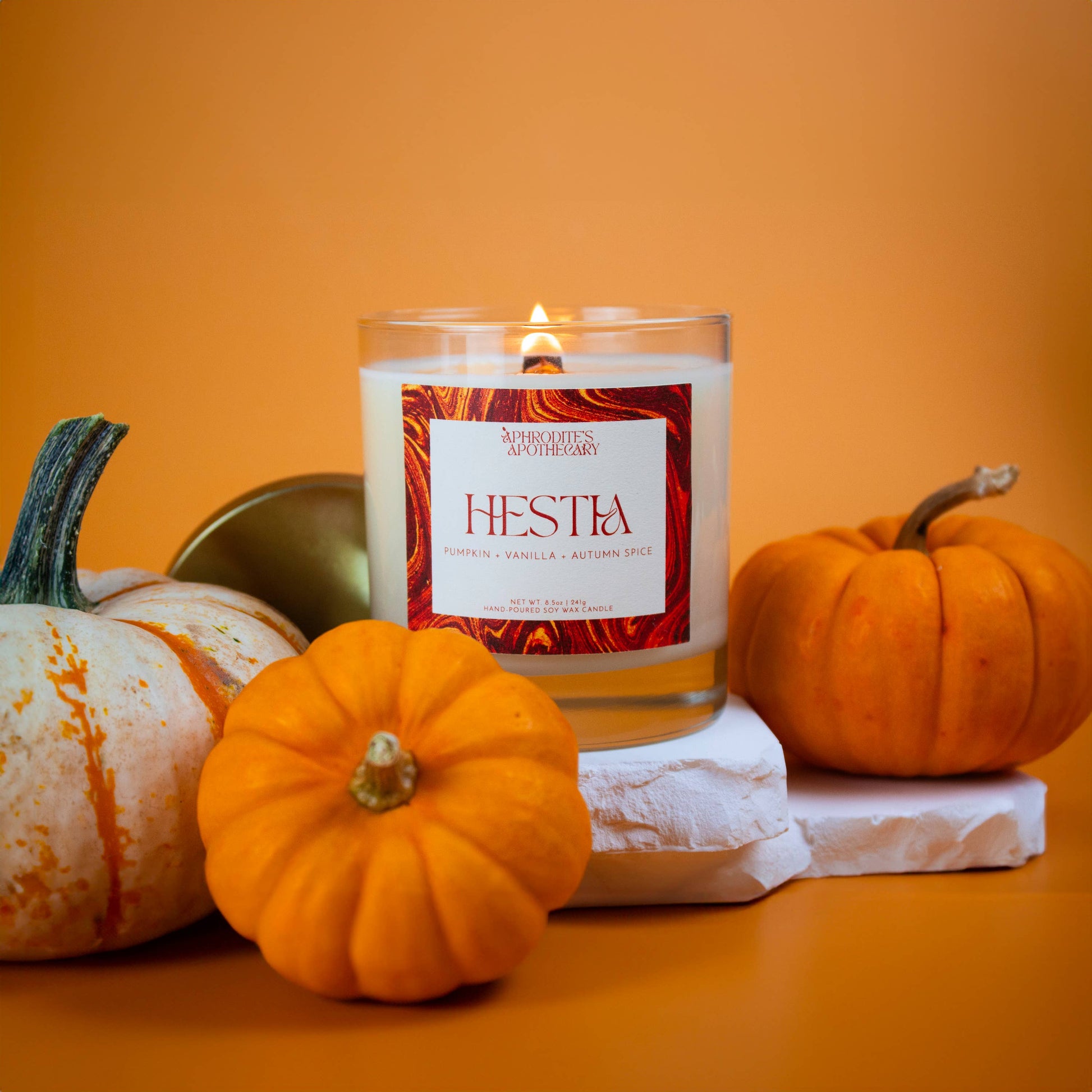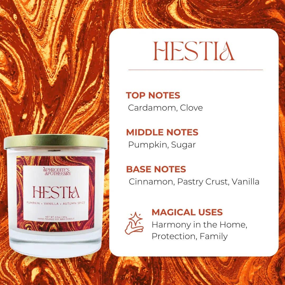 Our Hestia Candle combines pumpkin, nutmeg, cinnamon, and vanilla to create a warm and cozy vibe that's perfect for chilly autumnal days (or, any day you want to be cocooned in a warm blanket!). Hestia is the goddess of the hearth, home, and family life. Indulge in our Hestia Candle and let her warm, positive energy fill your home. As the scent of pumpkin pie spice wafts through the air and our one-of-a-kind x-shaped wood wick crackles, imagine yourself cozied up in a plush chair by a flickering fire.