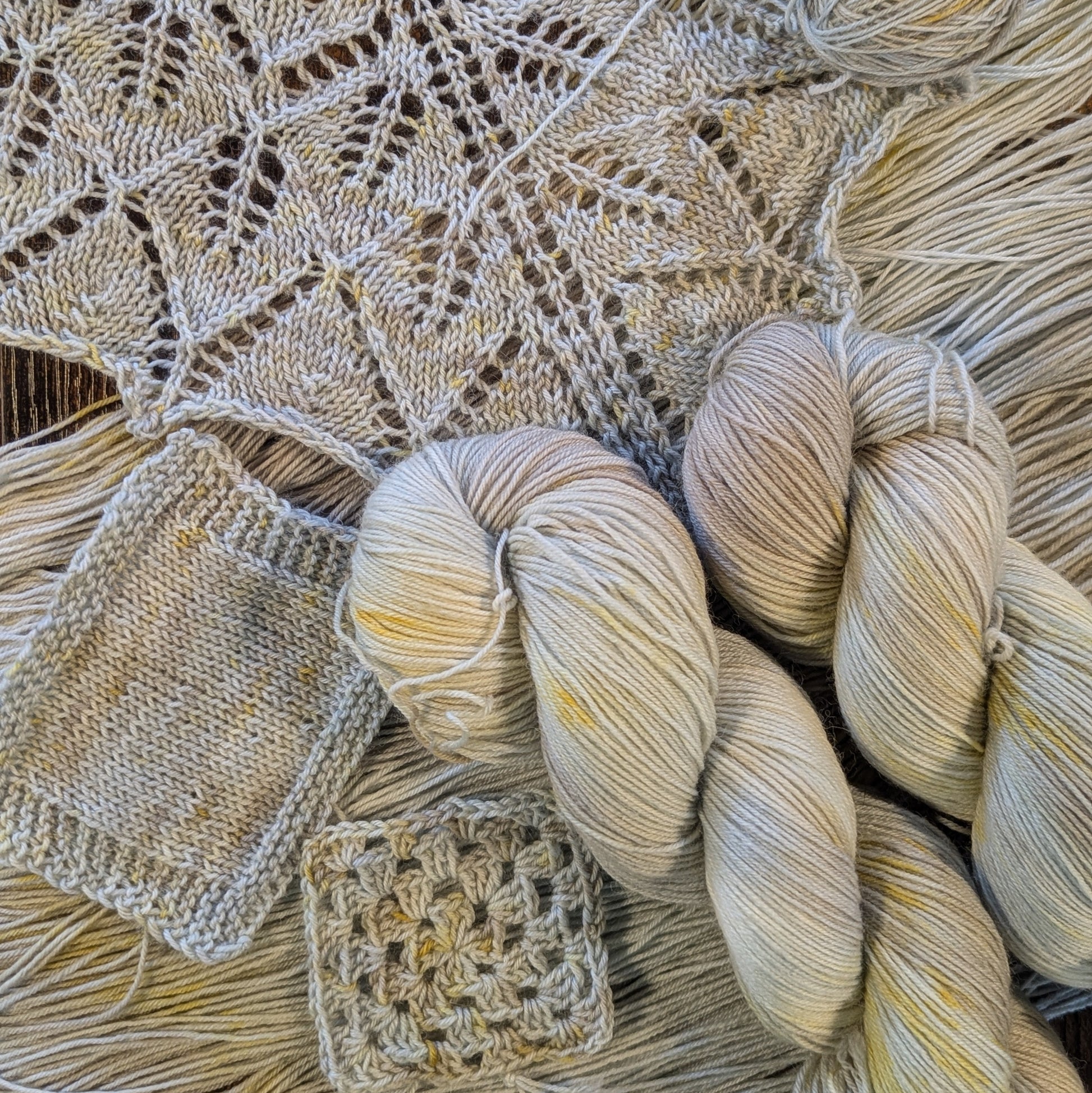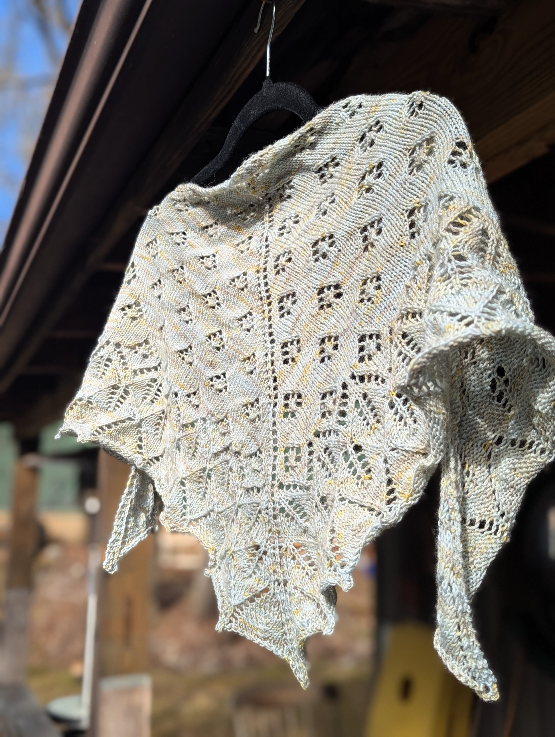 Pictured on 75/25 BFL/Nylon. Pattern is the Ashton Shawlette by Dee O'Keefe. A free pattern and an excellent introduction to lace work!