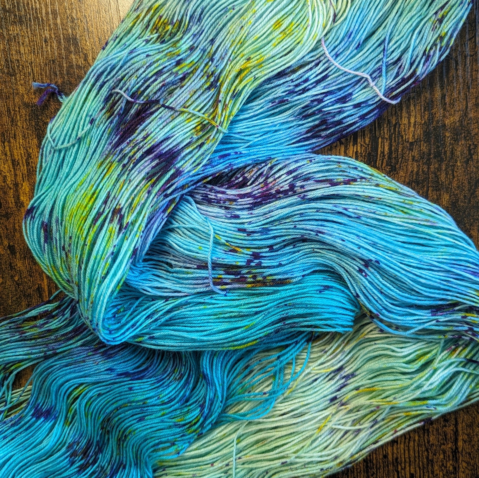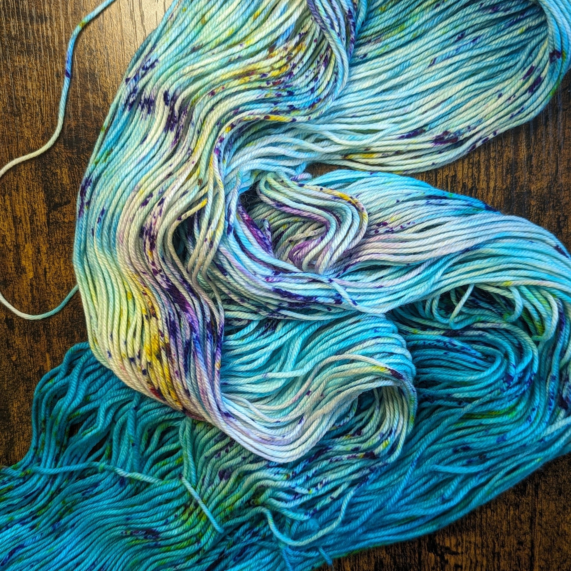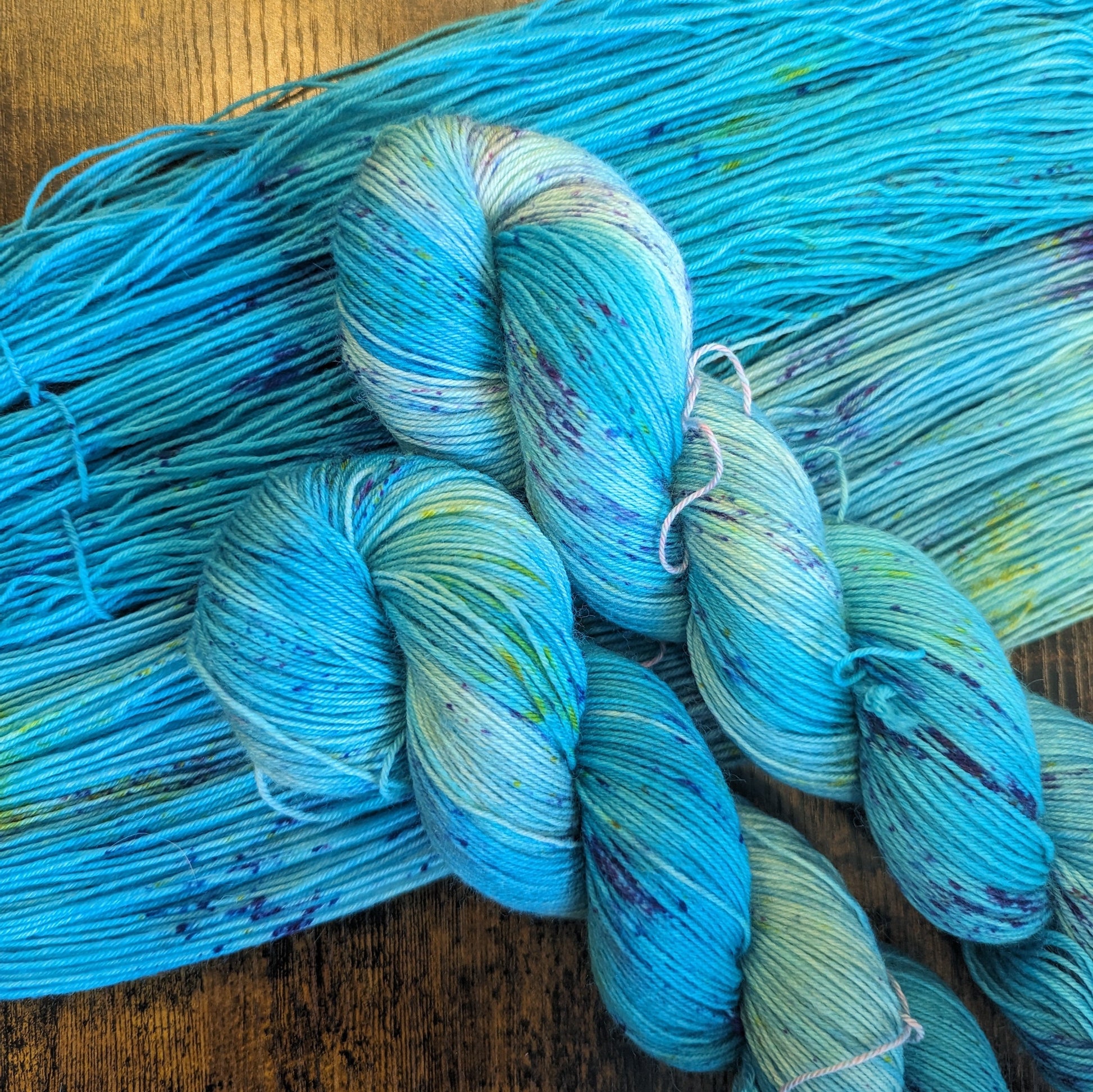 Poseidon is the God of the Sea. After the Defeat of Kronos, The world was divided into three and the oceans were given to Poseidon away from the Titan Oceanus. This yarn has the crystal blue of the Mediterranean with hints of yellows, purples, and greys.