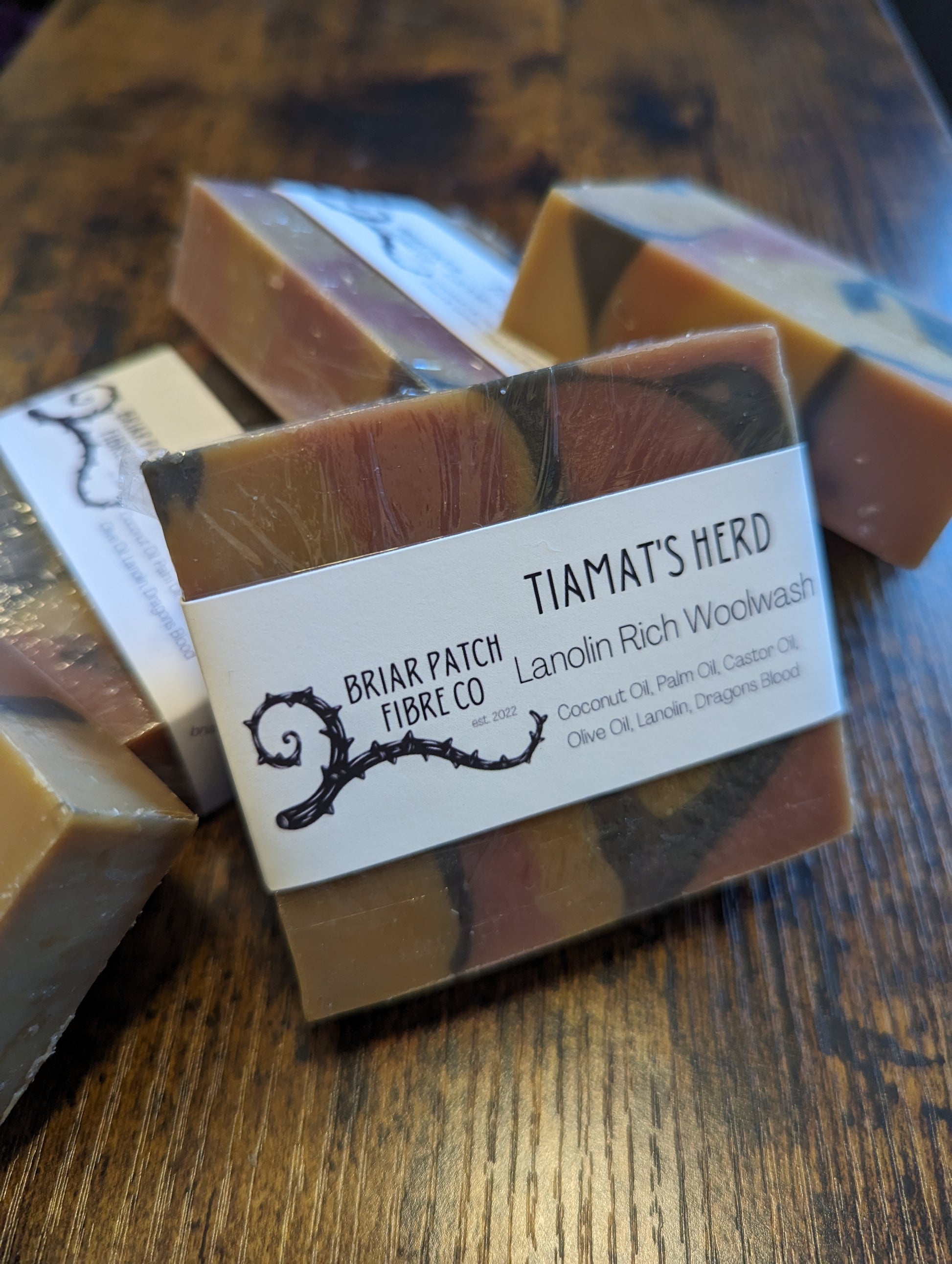 Tiamat's Herd is a lanolin rich soap locally made by Wildman Soaps exclusively for Briar Patch Fibre Co. It's so rich and creamy and leaves all your hand knits so amazingly soft. Try it on your wools and your cellulose fibers and experience the magic!